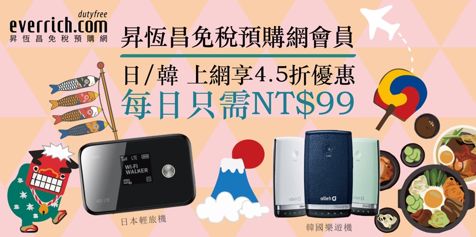 昇恆昌免稅預購網會員於活動期間預約日、韓Wi-Fi分享器,可享4.5折優惠,每天只要99元